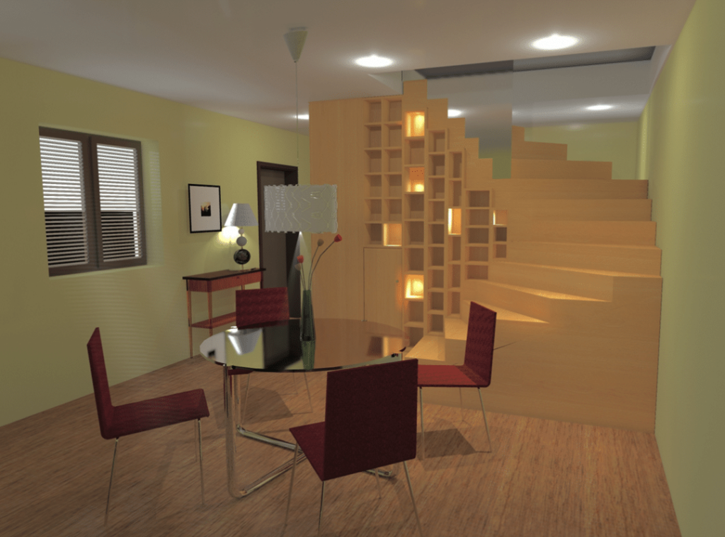 Thanks to the versatility of modern building materials and the creativity of AmbienTo Déco, the space beneath the stairs was cleverly utilized. The entire staircase was designed to support the weight of people using it, while also providing hidden storage on both sides and even within the steps themselves. For example, the side facing the kitchen was functional for that area, while the side near the living room featured shelves for decor or books, ensuring the guest had everything she needed within easy reach.