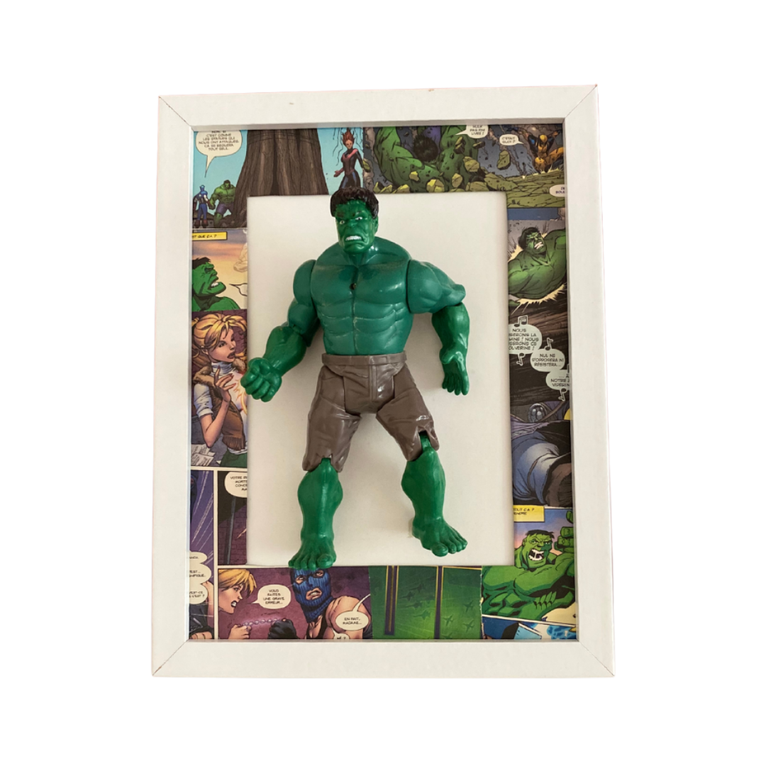 This three-dimensional art piece of the superhero Hulk blends pop art with creative recycling. The wooden frame holds a background made from a collage of comic book paper and a second-hand toy of the character, bringing to life a piece that celebrates recycling and Marvel fandom. Ideal for teen rooms, creative studios, or comic book collectors.