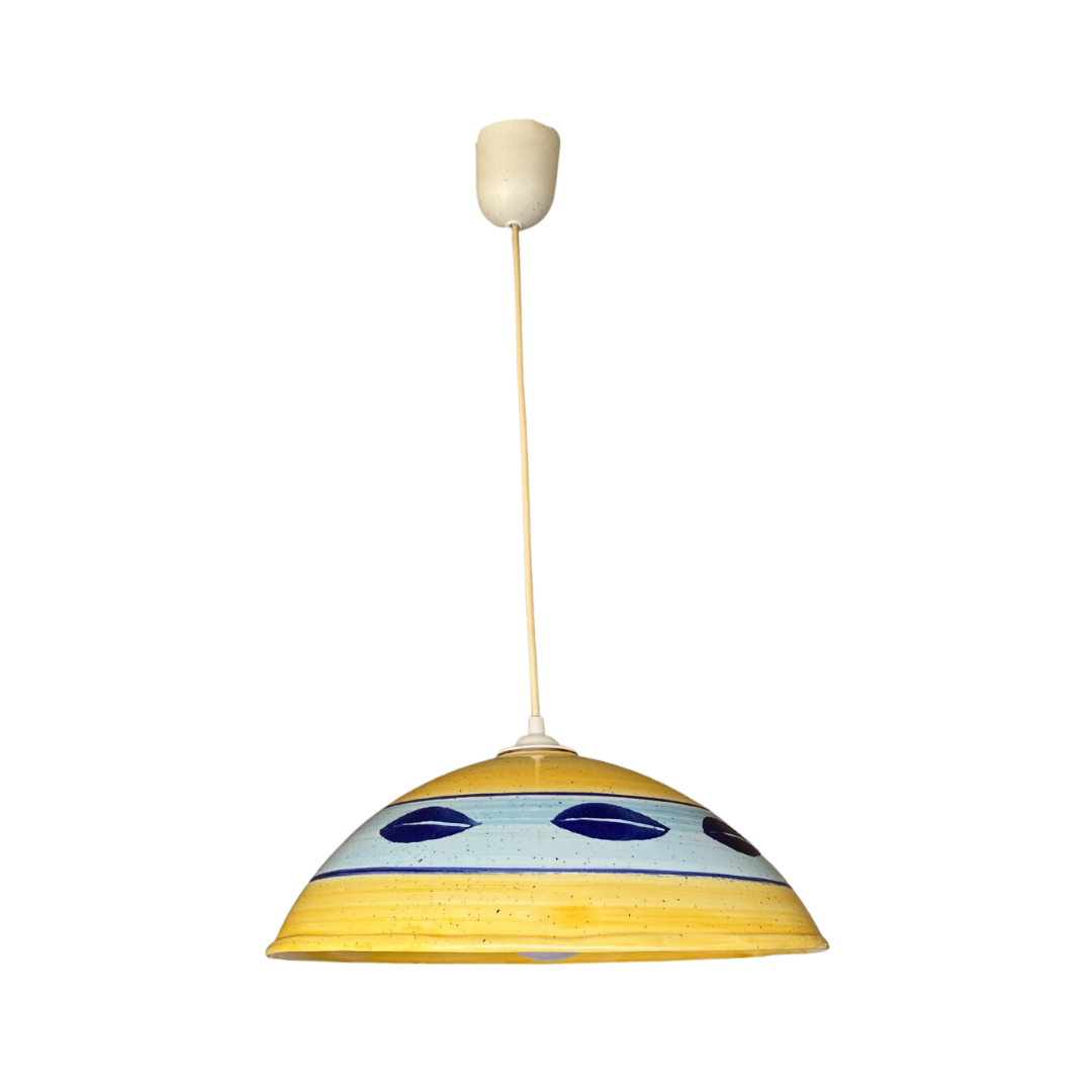 La Lampe Salade transforms a Mediterranean-style ceramic salad bowl into a unique hanging lamp, perfect for illuminating kitchens and dining rooms. With a yellow finish and blue details, this piece offers an unconventional and artistic alternative to standard lighting. It features Swiss electrical specifications (230V; 50Hz) adaptable to other European connections upon request.