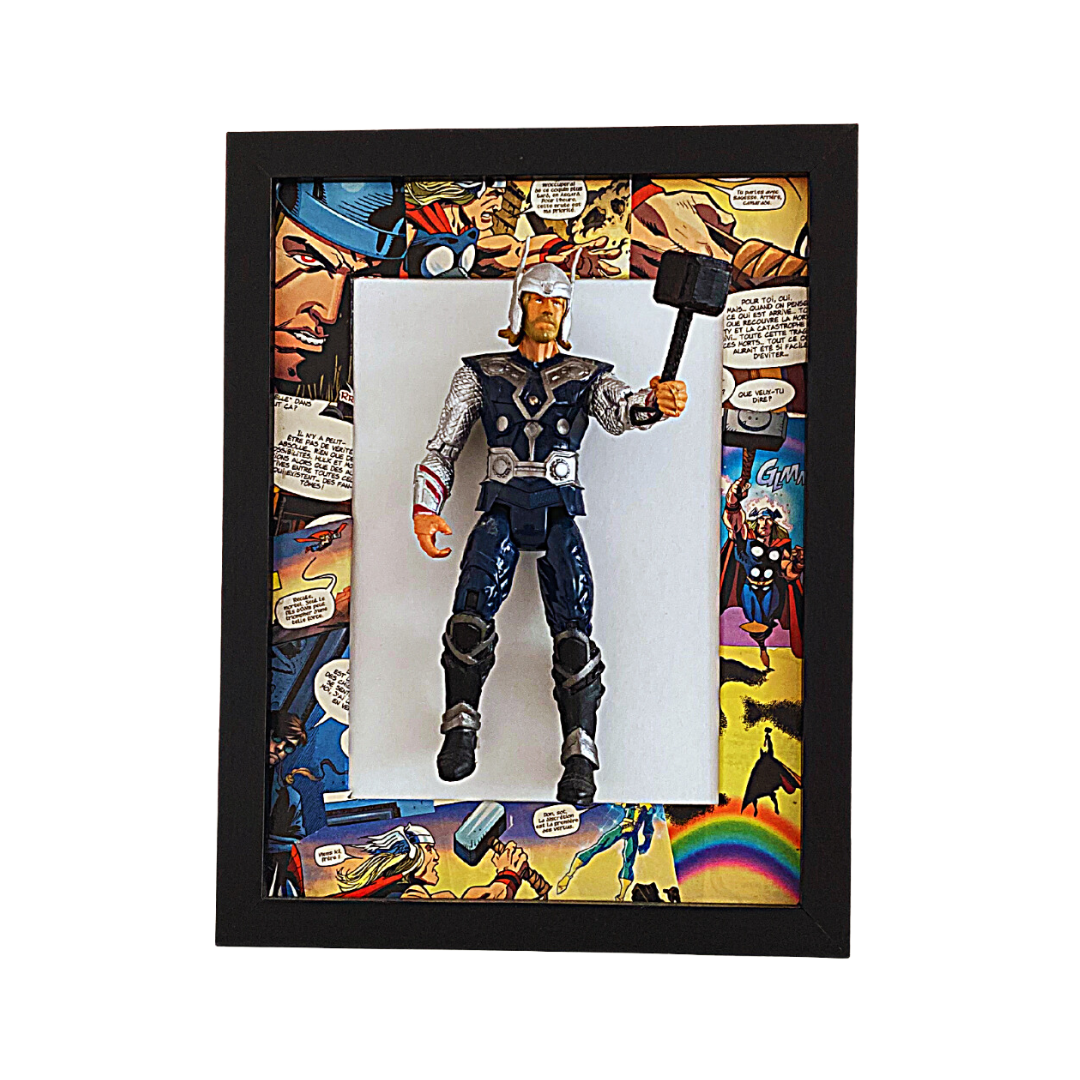 This three-dimensional frame of the superhero Thor combines sustainability and a love for literary art. The artwork is a sensory experience, featuring a comic book scene background and a Thor action figure emerging from the frame.